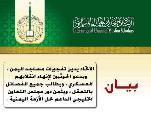 أصدر الاتحاد العالمي لعلماء المسلمين بيانا يدين فيه تفجيرات المساجد بالعاصمة اليمنية صنعاء ويصفها بالإجرامية ويدعو الحوثيين إلى العودة إلى ديارهم ، وإيقاف انقلابهم العسكري على اليمن وثورتها ، ويطال