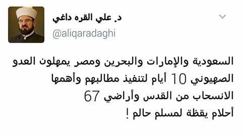 قال الأمين العام للاتحاد العالمي لعلماء المسلمين، د. علي القرة داغي، إن الأزمة الخليجية لن تنتهي إلا بتوقف دول الحصار عن قول الأكاذيب عن دولة قطر.وكتب “داغي” تغريدةٍ على حسابه الرسميّ في “ت