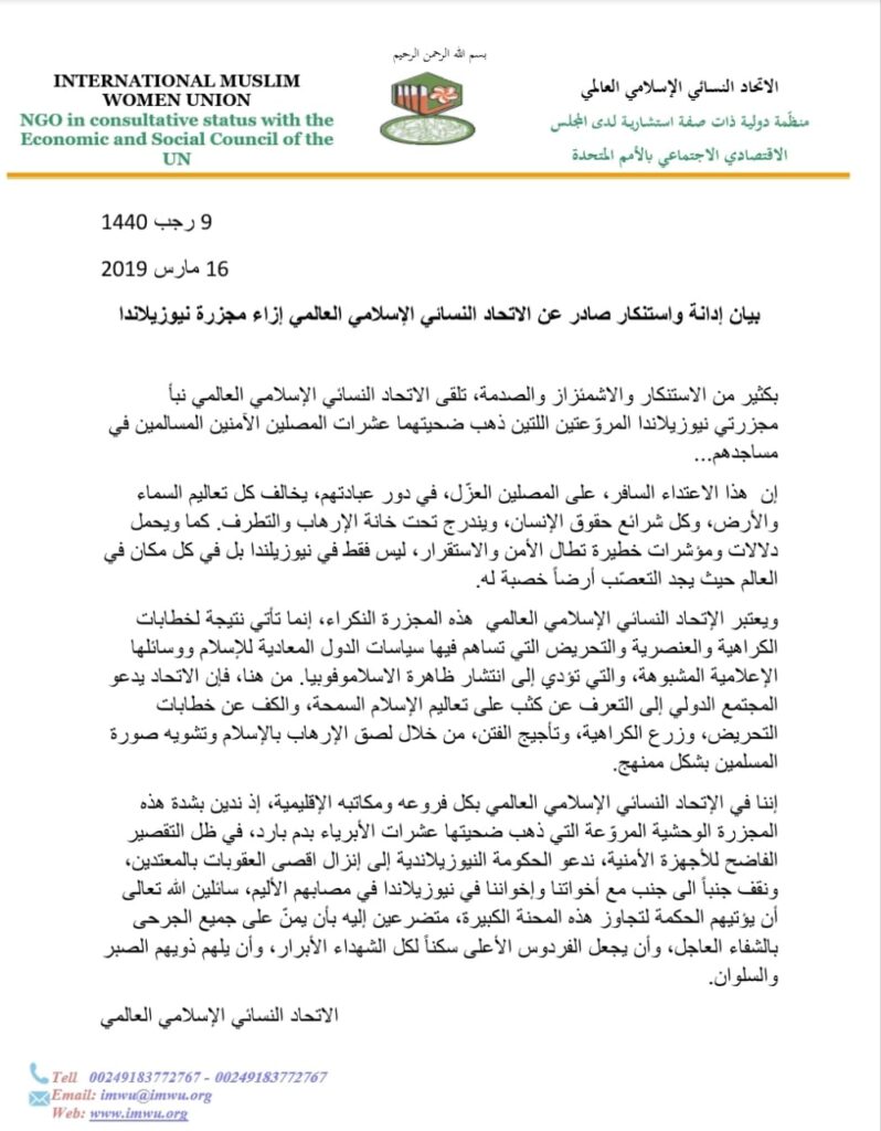 بيان إدانة واستنكار صادر عن الاتحاد النسائي الإسلامي العالمي إزاء مجزرة نيوزيلاندا