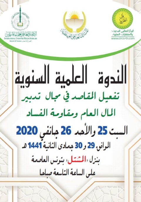 ينظم الاتحاد العالمي لعلماء المسلمين (فرع تونس) بالتعاون مع المركز العالمي للبحوث والاستشارات العلمية بتونس، والمنتدى العالمي للوسطية بالأردن ندوة دولية حول تفعيل المقاصد "في تدبير المال العام ومقاومة الفساد".