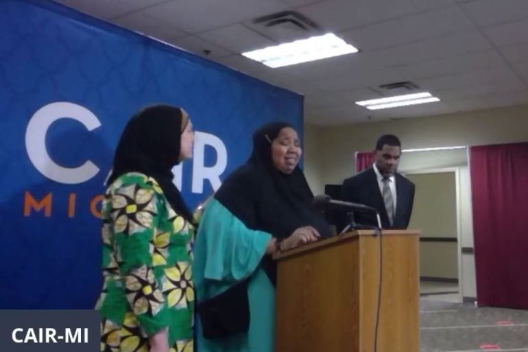 أمريكية مسلمة من أصل أفريقي تتهم شرطة ولاية ميشغان بالتعدي عليها ونزع حجابها، شارحة التفاصيل خلال مؤتمر صحفي بمقر مجلس العلاقات الأمريكية الإسلامية (كير)، مساء الأربعاء.