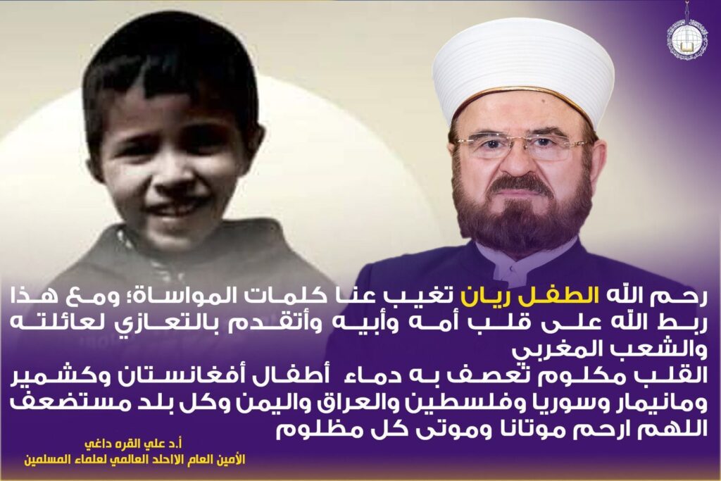 فارق الطفل ريان في المغرب، الحياة بعد مكوث خمسة أيام في الجب الضيق العميق الذي زلت قدمه فيه، مساء السبت، في ضواحي “مدينة شفشاون” شمالي المغرب ، وترحّم الشيخ الدكتور علي القره داغي الأمين العام للاتحاد العالمي لعلماء المسلمين على وفاته