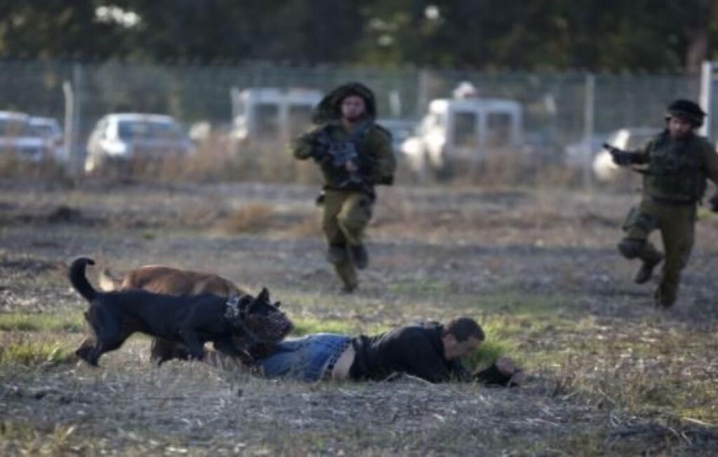 فيديو يُظهر كلبا إسرائيليا ينهش فلسطينيا خلال اعتقاله