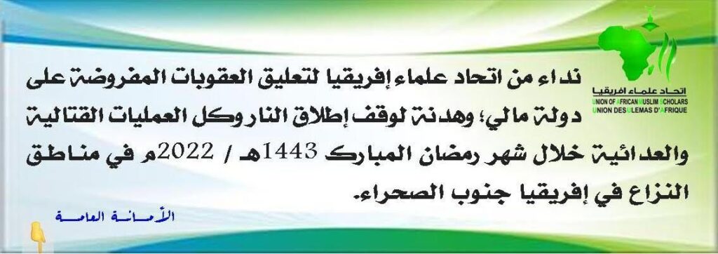 وجه اتحاد علماء إفريقيا نداء لتعليق العقوبات المفروضة على دولة مالي؛ وهدنة لوقف إطلاق النار وكل العمليات القتالية والعدائية خلال شهر رمضان 1443هـ / 2022م في مناطق النزاع في إفريقيا جنوب الصحراء.