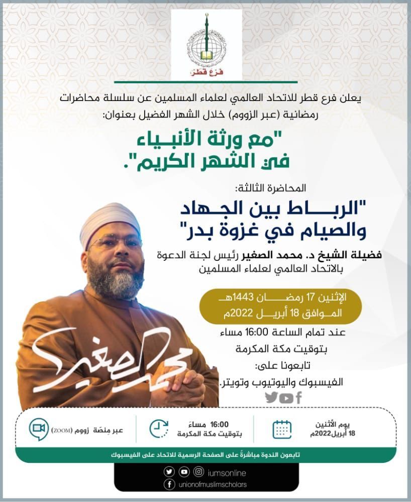 ضمن سلسلة محاضرات رمضانية “مع ورثة الأنبياء في الشهر الكريم”،، المحاضرة الثالثة: “الرباط بين الجهاد والصيام في غزوة بدر” – فضيلة الشيخ د. محمد الصغير رئيس اللجنة العلمية بفرع الاتحاد العالمي لعلماء المسلمين – دولة قطر