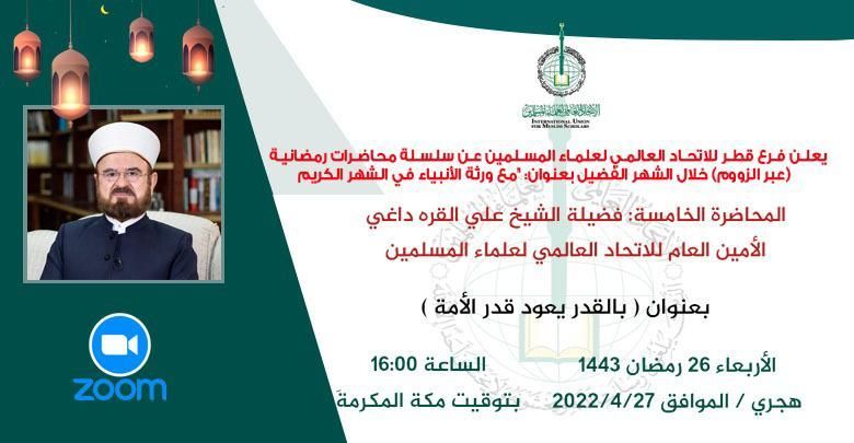 يعلن فرع قطر للاتحاد العالمي لعلماء المسلمين عن سلسلة محاضرات رمضانية (عبر الزووم) خلال الشهر الفضيل بعنوان: "مع ورثة الأنبياء في الشهر الكريم".