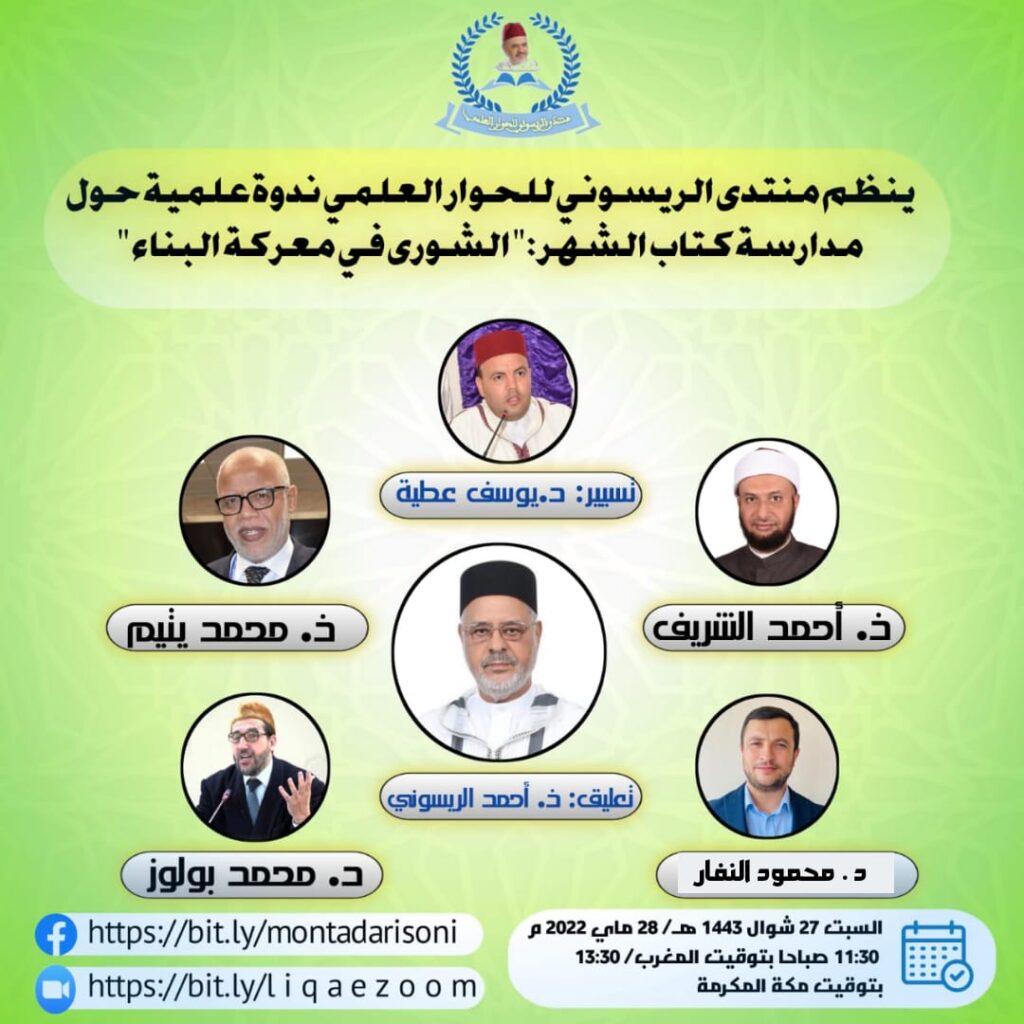 ينظم منتدى الريسوني للحوار العلمي ندوة علمية حول مدارسة كتاب الشهر: “الشورى في معركة البناء”