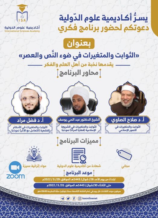 ينطلق اليوم الأحد، البرنامج الفكري ‹‹الثَّوابت والمتغيرات في ضوءِ النَّص والعصر››، والذي ينظمه أكاديمية علوم الدّولية، ويقدمه نخبةٌ من أهلِ العلم والفكر