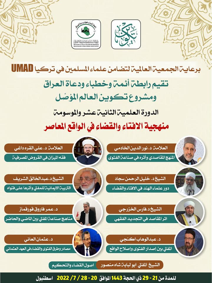ستُعقد بإذن الله تعالى الدورة العلمية الثانية عشر في اسطنبول والموسومة بــ (منهجية الإفتاء والقضاء في الواقع المعاصر) على عدد من كبار العلماء المتخصصين من مختلف دول العالم الإسلامي