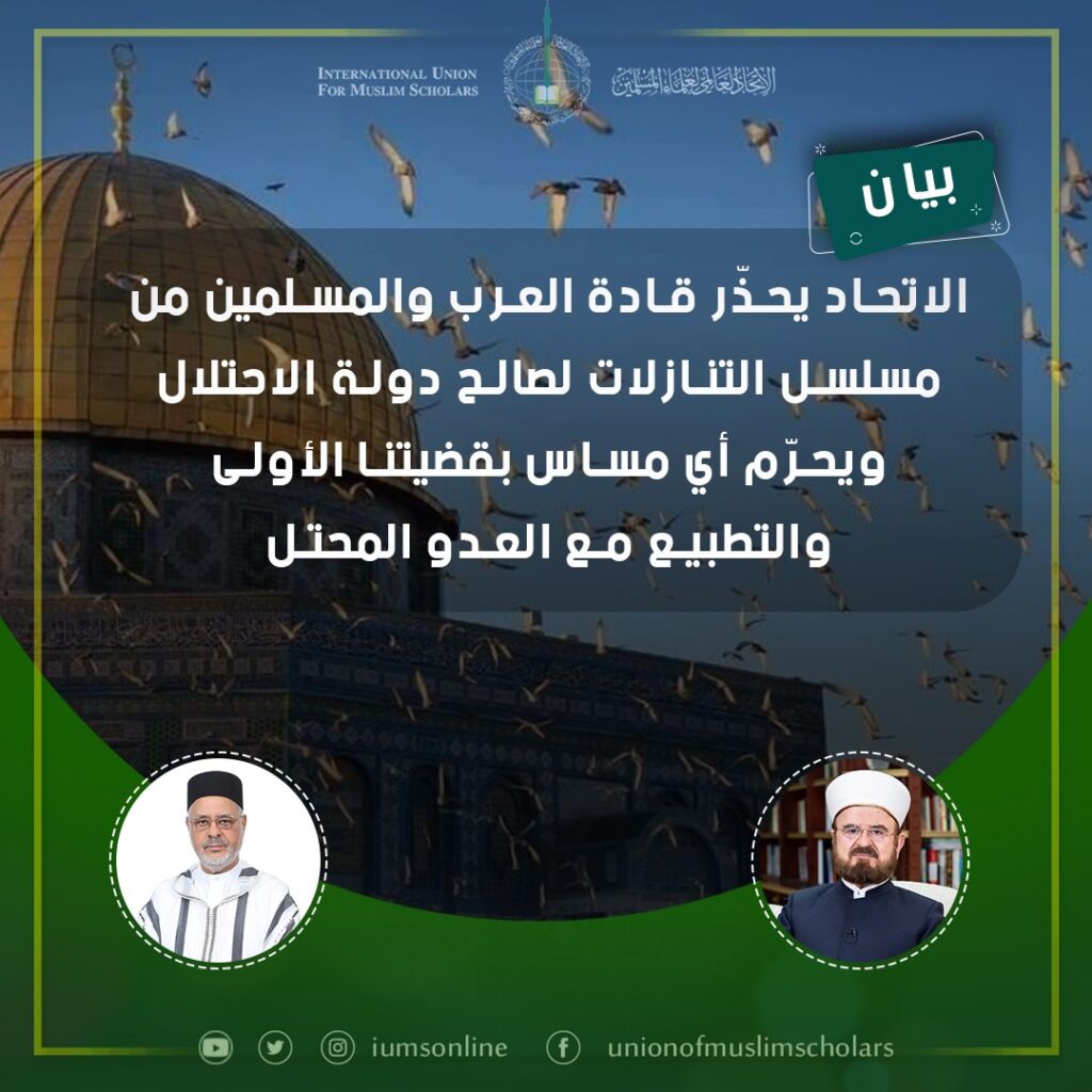 الاتحاد يحذّر قادة العرب والمسلمين من مسلسل التنازلات لصالح دولة الاحتلال ويحرّم أي مساس بقضيتنا الأولى والتطبيع مع العدو المحتل
