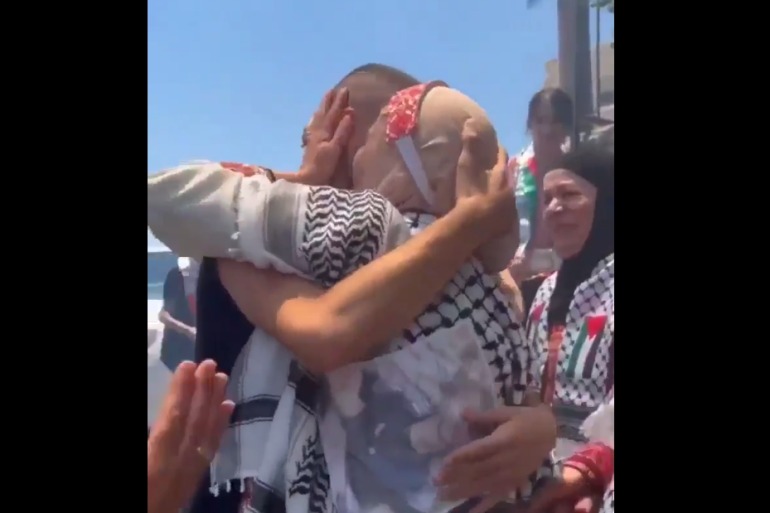 لحظات مؤثرة لاستقبال والدة الأسير المحرر إبراهيم حنيطي (19 عامًا)، ابنها بالعناق والقبلات وهي تردد “الحمد لله” بعد اعتقال دام 14 شهرًا في سجون الاحتلال الإسرائيلي