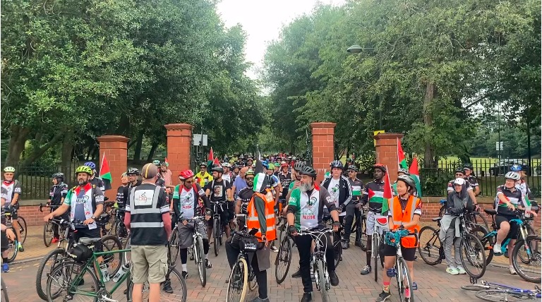 مئات الناشطين في بريطانيا يشاركون بمسيرة الدراجات التي تهدف إلى رفع الوعي بالقضية الفلسطينية ومساوئ الاحتلال الإسرائيلي، وجمع تبرعات لمساعدة الشعب الفلسطيني