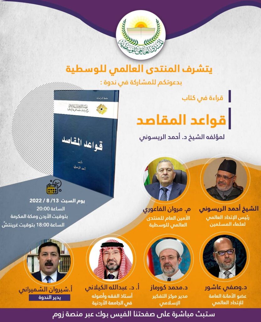 المنتدى العالمي للوسطية يقيم ندوة دولية عامة، يوم السبت 13 أغسطس الجاري، لمناقشة كتاب “قواعد المقاصد” للشيخ الدكتور أحمد الريسوني رئيس الاتحاد