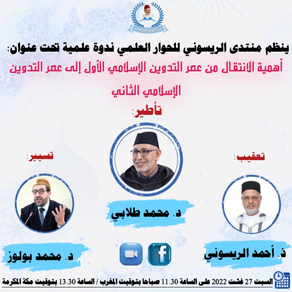 ينظم منتدى الريسوني للحوار العلمي محاضرة بعنوان (أهمية الانتقال من عصر التدوين الإسلامي الأول إلى عصر التدوين الإسلامي الثاني)، تأطير ذ. محمد طلابي، وتعليق ذ. أحمد الريسوني