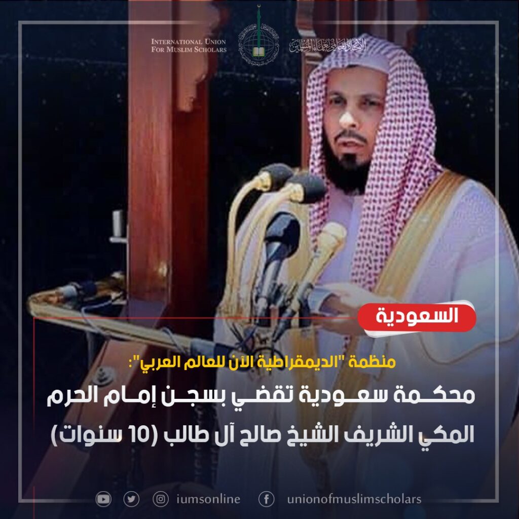ذكرت منظمة “الديمقراطية الآن للعالم العربي” يأن محكمة سعودية قضت بالسجن إمام الحرم المكي الشريف الشيخ صالح آل طالب (10 سنوات)