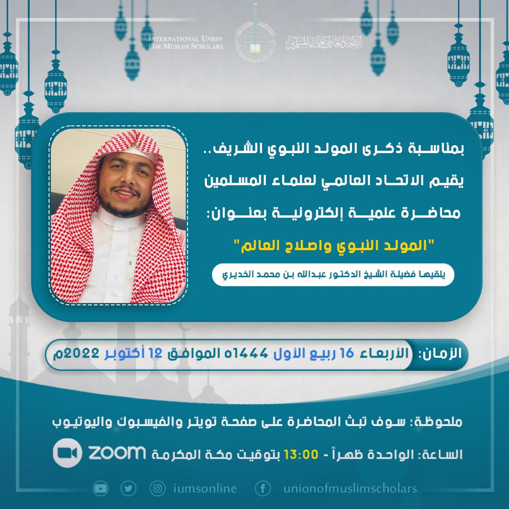 بمناسبة ذكرى المولد النبوي الشريف، يلقي فضيلة الشيخ الدكتور عبدالله بن محمد الخديري عضو الاتحاد العالمي لعلماء المسلمين، محاضرة علمية إلكترونية بعنوان: “المولد النبوي واصلاح العالم”