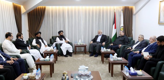 لقاء يجمع رئيس المكتب السياسي لحركة “حماس” إسماعيل هنية، والمتحدث باسم الحكومة الأفغانية ذبيح الله مجاهد، وعدد من المسؤولين الأفغان، بإسطنبول