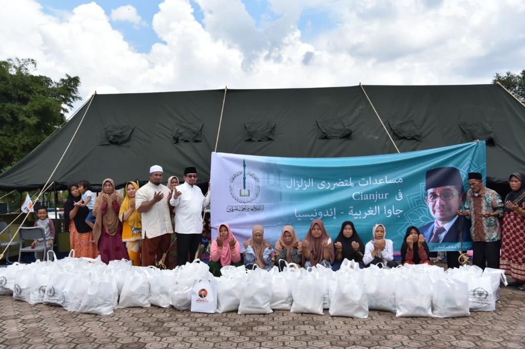 رئيس الاتحاد العالمي لعلماء المسلمين, د. سالم سقاف الجفري قدم عددًا من الطرود الغذائية الأساسية للسكان المتضررين من الزلزال في وارونغكوندانغ ، سيانجور ، جاوة الغربية ، إندونيسيا (28/11/2022).