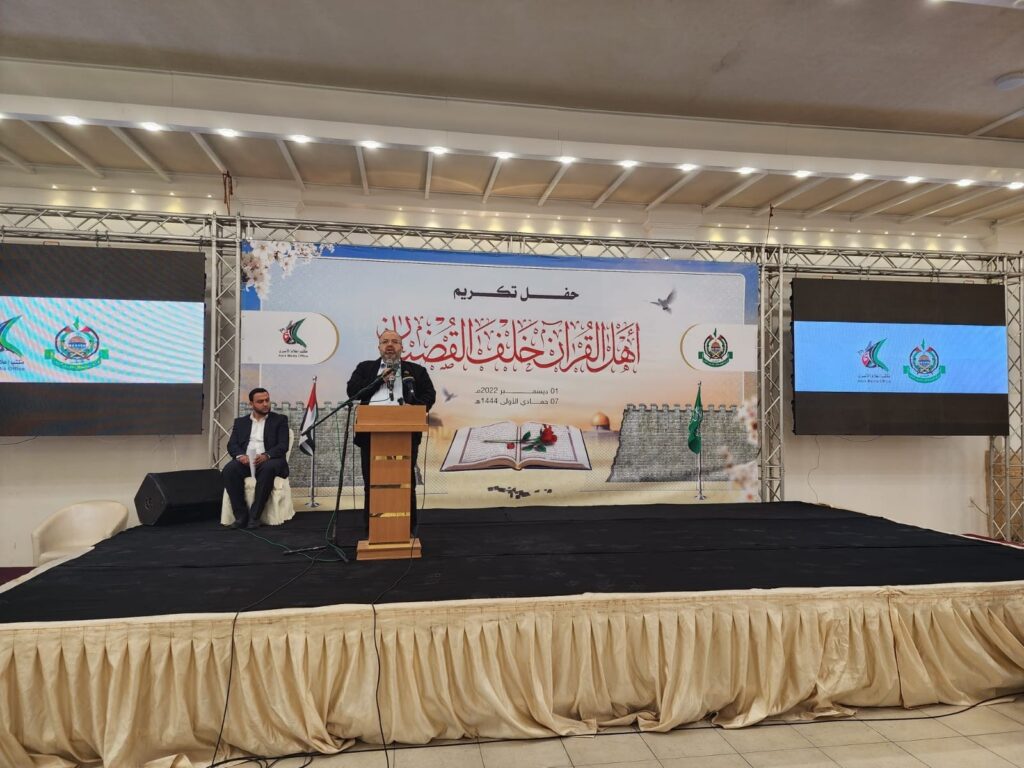 نظمت حماس بالتعاون مع مكتب إعلام الأسرى، يوم الخميس، حفلًا بمدينة غزة لتكريم 74 أسيرًا داخل السجون أتموا حفظ القرآن الكريم كاملًا