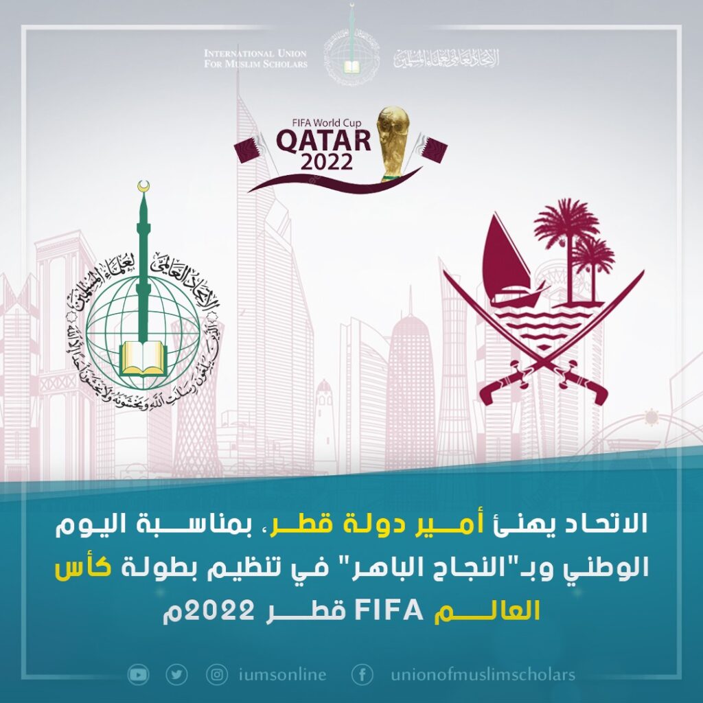 الاتحاد العالمي لعلماء المسلمين يهنئ حضرة صاحب السمو/ الشيخ تميم بن حمد آل ثاني أمير دولة قطر، بمناسبة اليوم الوطني المجيد للدولة، وكذلك بالتنظيم الرائع لبطولة كأس العالم فيفا قطر 2022م