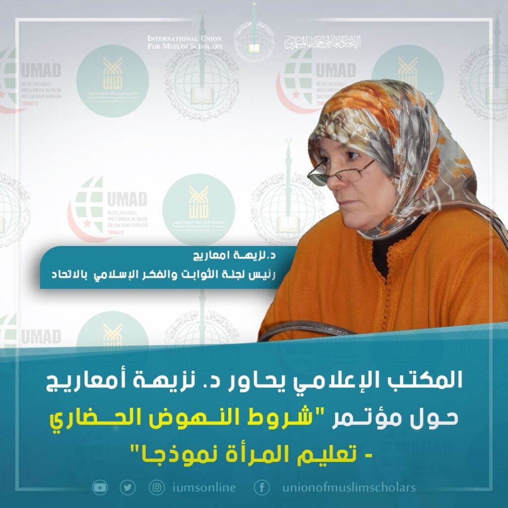 المكتب الإعلامي يحاور د. نزيهة أمعاريج حول مؤتمر “شروط النهوض الحضاري – تعليم المرأة نموذجا”