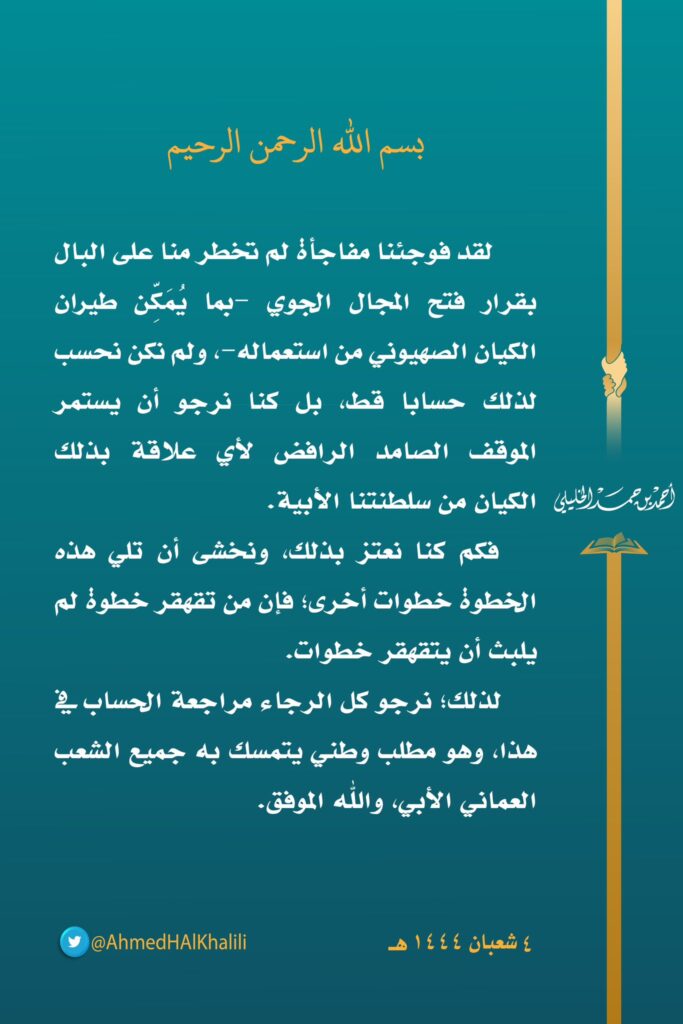 المفتي العماني الشيخ أحمد بن حمد الخليلي انتقد قرار حكومة عمان بفتح أجواء البلاد للطائرات الإسرائيلية