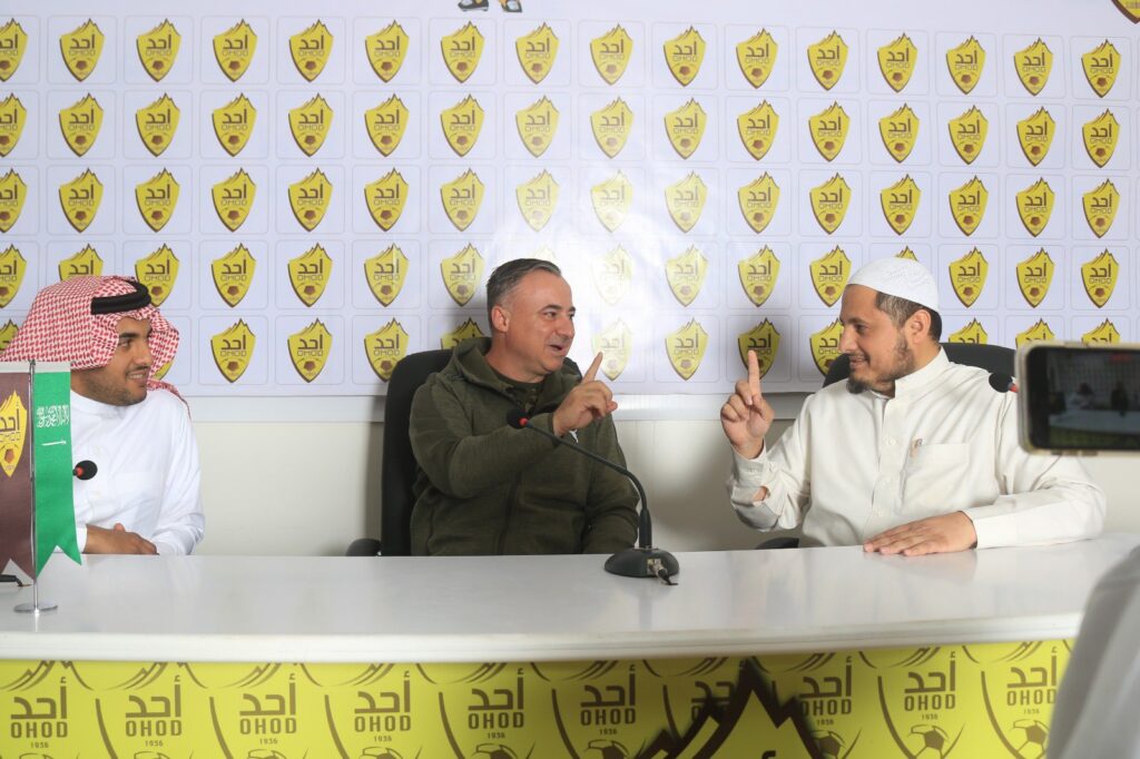 مدرب فريق الأشبال في نادي “أُحُد” الرياضي السعودي، بورقا دانيلو، اعتناقه الإسلام في قاعة المركز الإعلامي بالنادي، وسط حضور حيان بن مثني اليافعي ممثل جمعية الدعوة والإرشاد وتوعية الجاليات بمنطقة المدينة المنورة