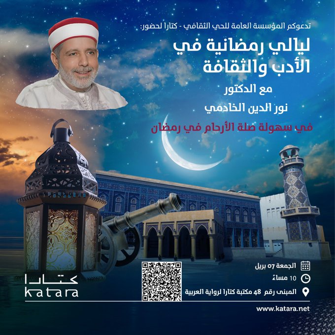 تُنظم مؤسسة الحي الثقافي كتارا في الدوحة، قطر، محاضرة حول سهولة صلة الأرحام في رمضان، ضمن سلسلة المحاضرات التي تُقام تحت عنوان “ليالي رمضانية في الأدب والثقافة”. ستُعقد المحاضرة في مكتبة كتارا، في السابع من أبريل عام 2023، وذلك في تمام الساعة العاشرة ليلاً بتوقيت مكة المكرمة.