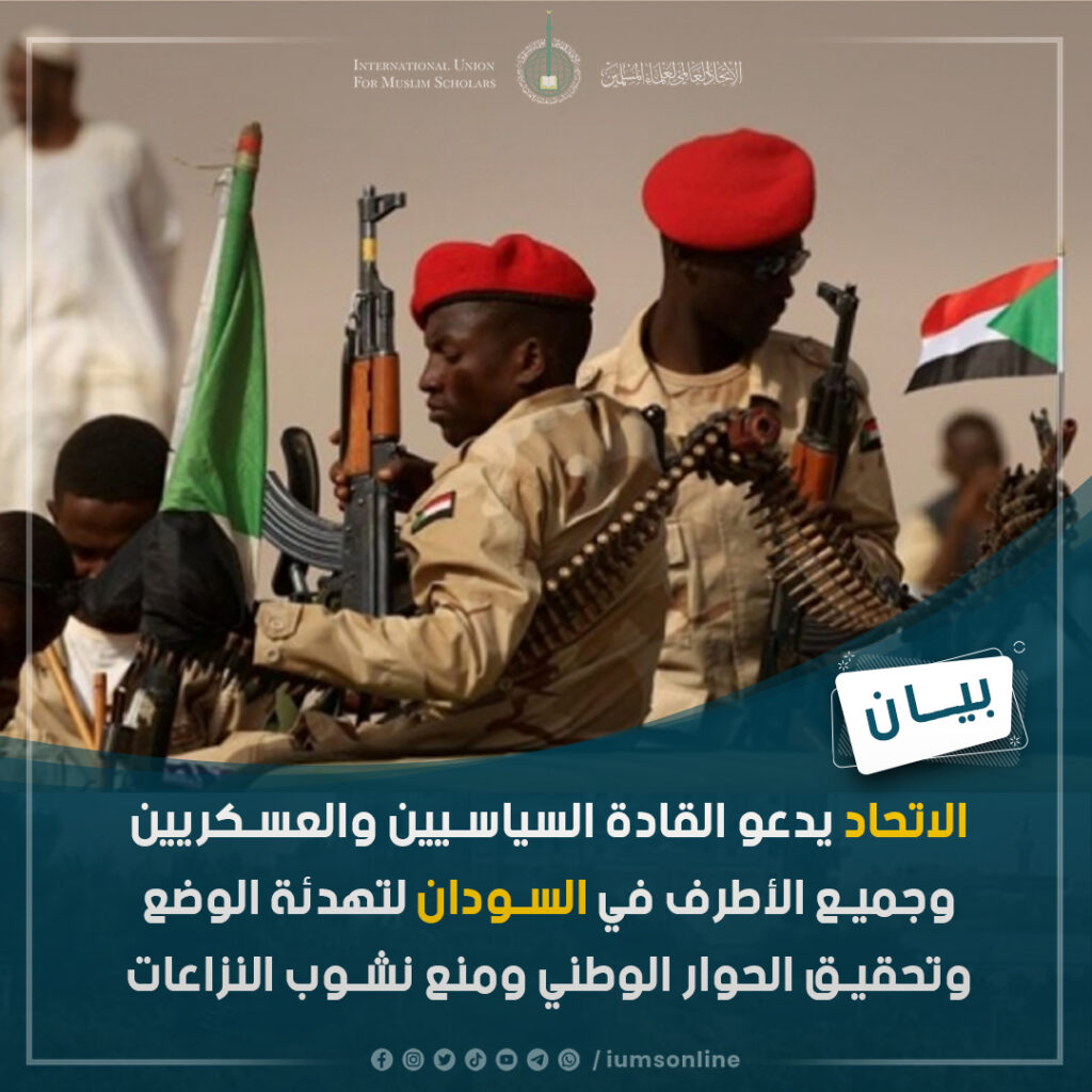 الاتحاد العالمي لعلماء المسلمين يدعو القادة السياسيين والعسكريين وجميع الأطرف إلى تهدئة الوضع ووقف الاقتتال فورا، وحل النزاعات وإرساء الحوار الوطني بين الفرقاء السياسيين والعسكريين، وتجنب نشر الخطاب التحريضي