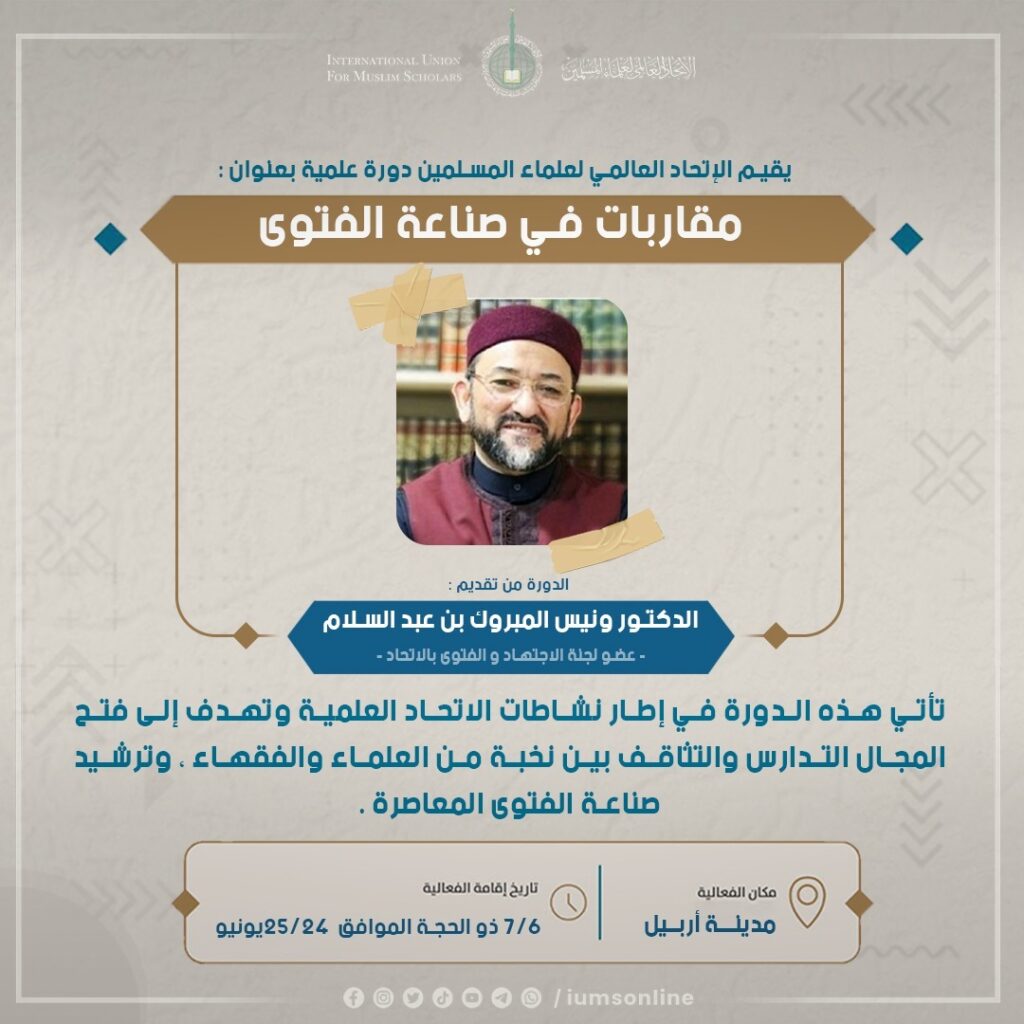 ينظم الإتحاد العالمي لعلماء المسلمين دورة علمية بعنوان “مقاربات في صناعة الفتوى” ويؤطرها الدكتور ونيس المبروك بن عبد السلام، عضو لجنة الفتوى وعضو مجلس الأمناء بالاتحاد