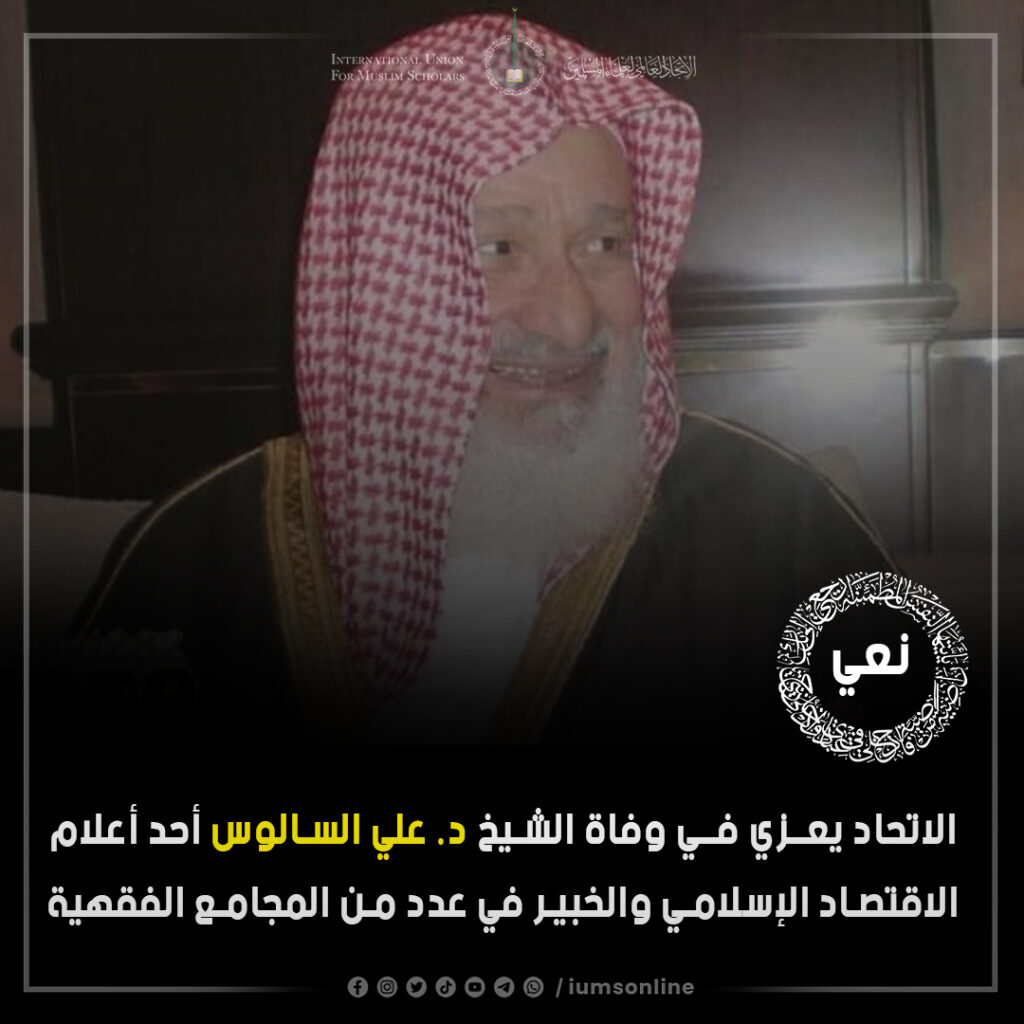 الاتحاد العالمي لعلماء المسلمين يعزي في وفاة فضيلة الشيخ الدكتور علي السالوس، أحد أعلام الاقتصاد الإسلامي والخبير في عدد من المجامع الفقهية، بعد مسيرة حافلة من الدعوة والعطاء والإنتاج الفكري عن عمر 89 عاما
