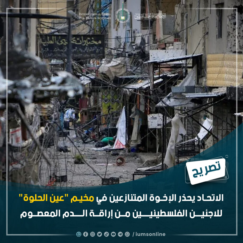 ببالغ الأسى والقلق، يراقب الاتحاد العالمي لعلماء المسلمين ما يجري في مخيم “عين الحلوة” للاجئين الفلسطينيين بالقرب من صيدا جنوب لبنان، من اشتباكات مسلحة، في هذا المخيم الذي يعاني من الفقر المدقع ويشهد حركة نزوح واسعة داخله وإلى خارجه، إضافة إلى اندلاع نزاعات وتوترات تؤدي إلى تفاقم الوضع الإنساني وانتهاك حقوق الإنسان ومعاناة السكان المستمرة.