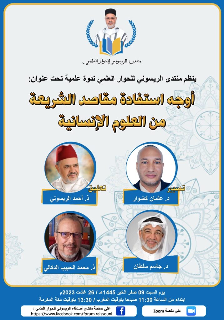 منتدى الريسوني للحوار العلمي ينظم ندوة علمية حول موضوع: “أوجه استفادة مقاصد الشريعة من العلوم الإنسانية”، اليوم السبت 10 صفر 1445هــ الموافق 26 اغسطس 2023م