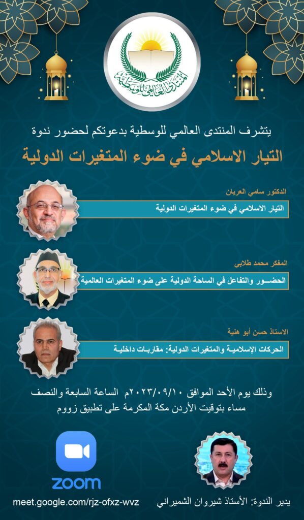 المنتدى العالمي للوسطية في إطار أنشطته الشهرية تعقد ندوة إلكترونية بعنوان؛ “التيار الإسلامي في ضوء المتغيرات الدولية” يوم الأحد الموافق 10 سبتمبر 2023 في تمام الساعة 19:30 مساءً بتوقيت الأردن ومكة المكرمة