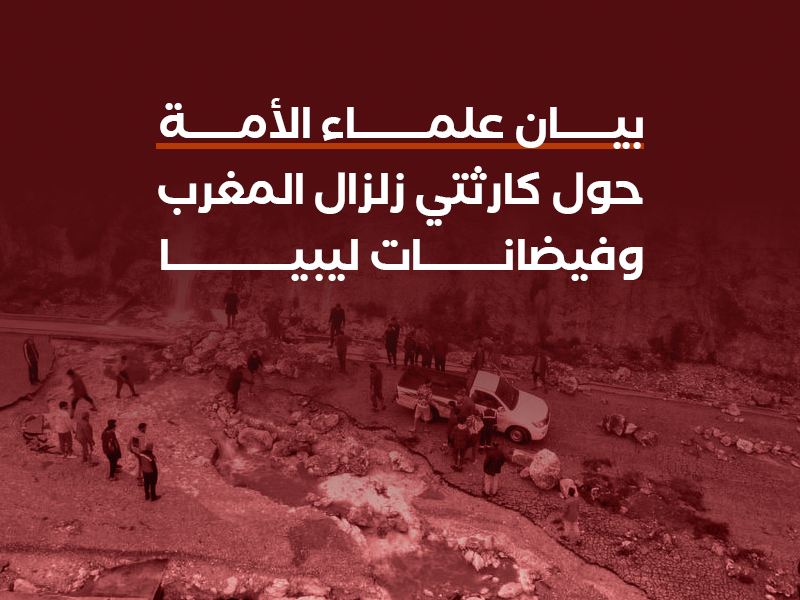 ثلة من علماء الأمة -مع اختلاف مؤسساتهم وتوجهاتهم- يتقدمون بتعازيهم الصادقة لأسر الضحايا وللمصابين الذين تأثروا بالكوارث الطبيعية في المغرب وليبيا، نتيجة الزلزال والإعصار الذي تسبب في فيضانات مدمرة في هاتين البلدين الشقيقتين