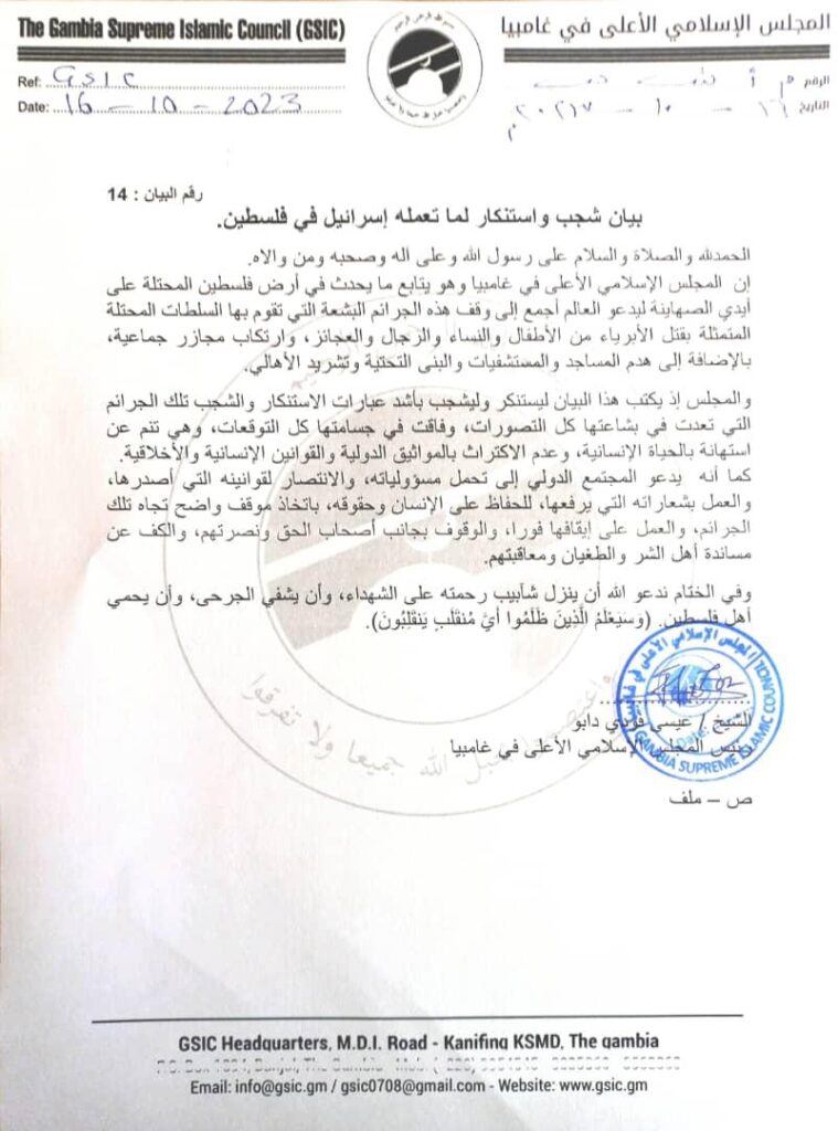 أصدر المجلس الإسلامي الأعلى في غامبيا بيانًا يدين بشدة الأفعال البشعة التي ترتكبها السلطات الإسرائيلية في أرض فلسطين المحتلة.