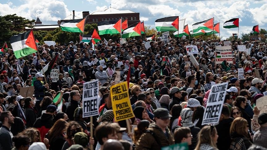 ومتظاهرون آخرون يتجمعون في ساحة بالعاصمة واشنطن وينظمون مسيرة تضامن مع فلسطين