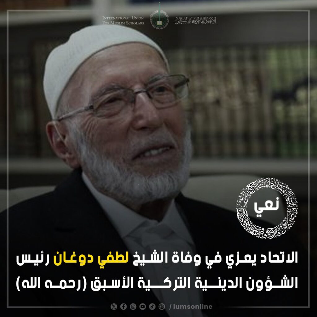 الاتحاد العالمي لعلماء المسلمين يعزي بقلوب مفعمة بالرضا بقضاء الله وقدره رئيس الشؤون الدينية الأسبق لطفي دوغان، الذي وافته المنية في مستشفى جامعة باشكنت بالعاصمة أنقرة، عن عمر ناهز 93 عامًا