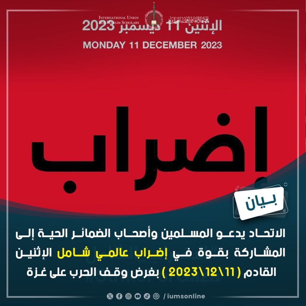 الاتحاد العالمي لعلماء المسلمين يدعو المسلمين وأصحاب الضمائر الحية إلى المشاركة بقوة في إضراب عالمي شامل غداً الإثنين القادم (11122023) بغرض وقف الحرب على غزة