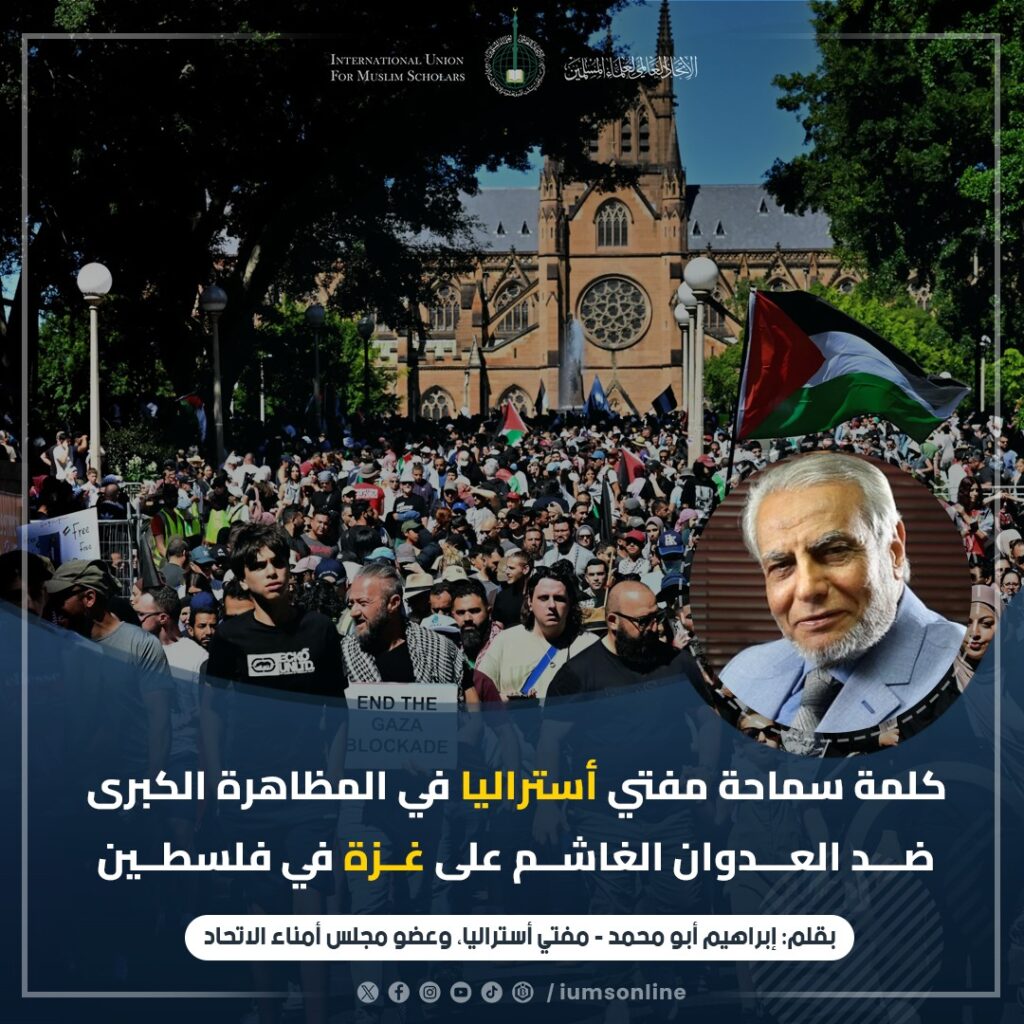 ألقى سماحة مفتي أستراليا وعضو مجلس أمناء الاتحاد العالمي لعلماء المسلمين أ. د. إبراهيم أبو محمد، كلمة في المظاهرة الكبرى ضد العدوان الإسرائيلي على قطاع غزة في فلسطين يوم الأحد 12 ديسمبر الجاري