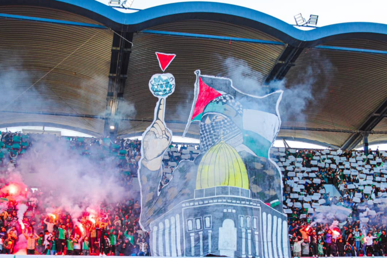 جماهير نادي الأهلي طرابلس الليبي ترفع لافتات تعبّر عن دعمها القوي للمقاومة الفلسطينية ولقطاع غزة، مستنكرة الهجمات الإسرائيلية على القطاع