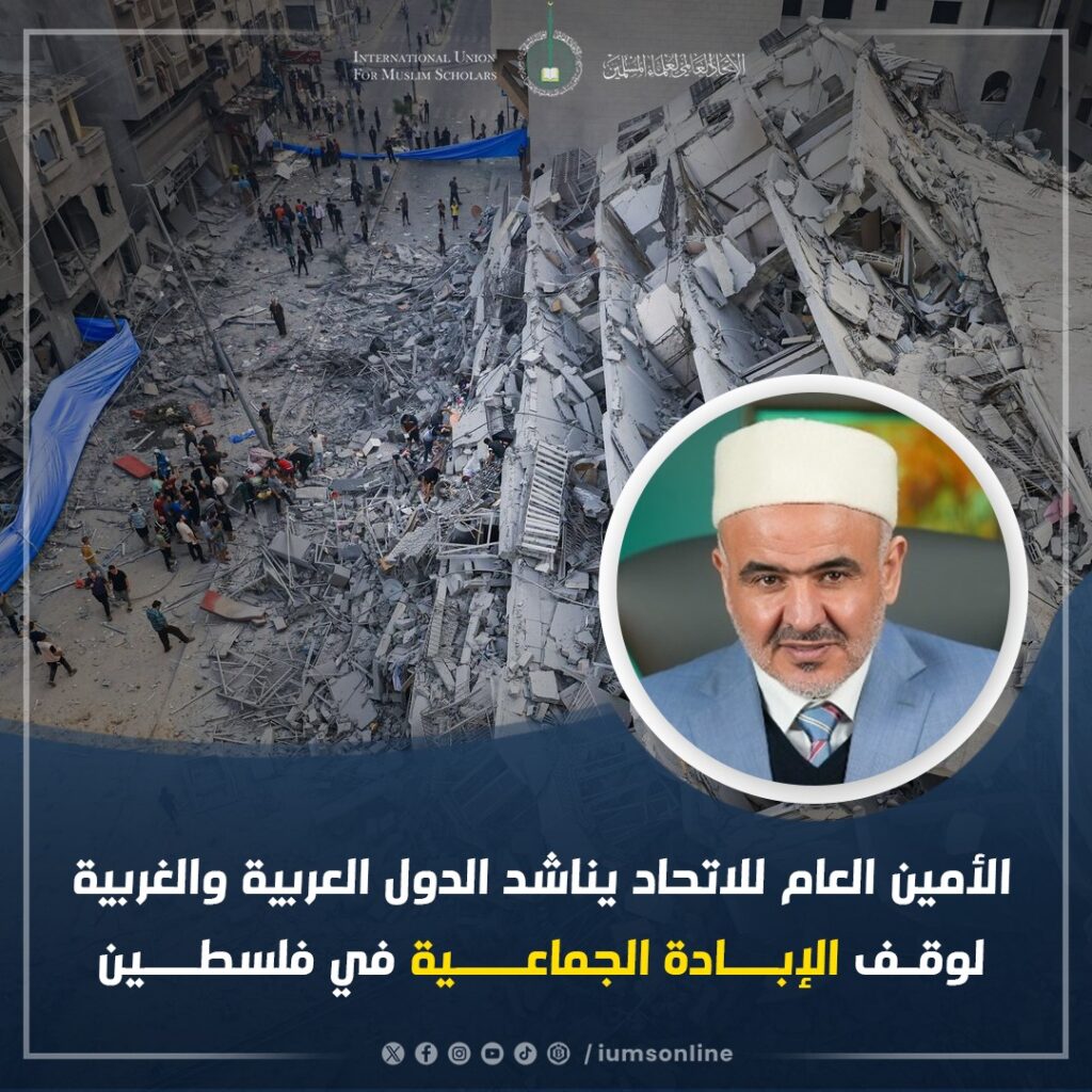 الأمين العام للاتحاد العالمي لعلماء المسلمين يدعو دول العالم العربي والغربية إلى التحرك بشكل فوري لوقف الإبادة الجماعية التي يمارسها الاحتلال الإسرائيلي ضد الشعب الفلسطيني، وذلك للشهر الرابع على التوالي