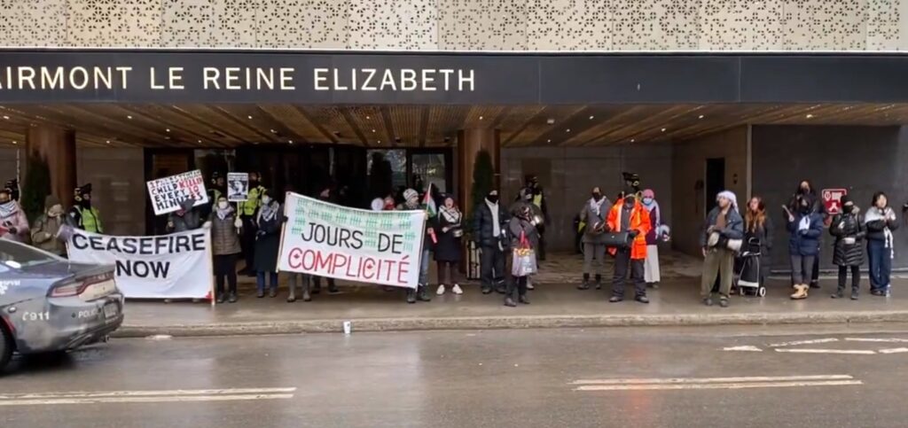 نشطاء مؤيدون لفلسطين ينظمون مظاهرات أمام أحد الفنادق في مدينة مونتريال الكندية، حيث كان رئيس الوزراء جاستن ترودو يجتمع مع أفراد حكومته، احتجاجًا على سياساتهم تجاه الحرب الإسرائيلية في قطاع غزة