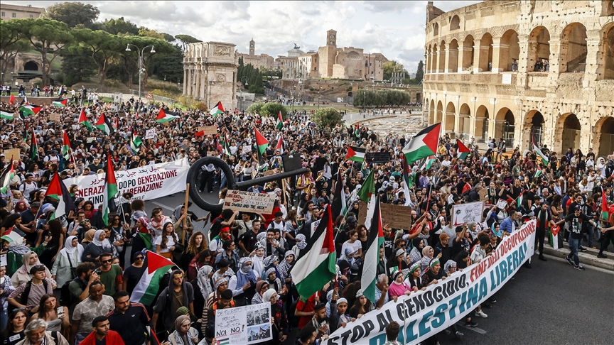 مظاهرات داعمة لحقوق الشعب الفلسطيني في العاصمة الإيطالية روما ومدينة ميلانو رغم التأجيل الذي شهدته بسبب الضغط الذي وجَّهته الجالية اليهودية ورغم الحظر الذي فرضته السلطات