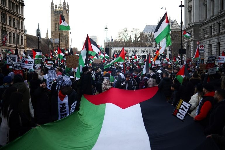 آلاف المتظاهرين يخرجون في عدة عواصم أوروبية في تظاهرات تضامن مع فلسطين وتنديداً بالعدوان الإسرائيلي المستمر على قطاع غزة لمدة تقارب أربعة أشهر