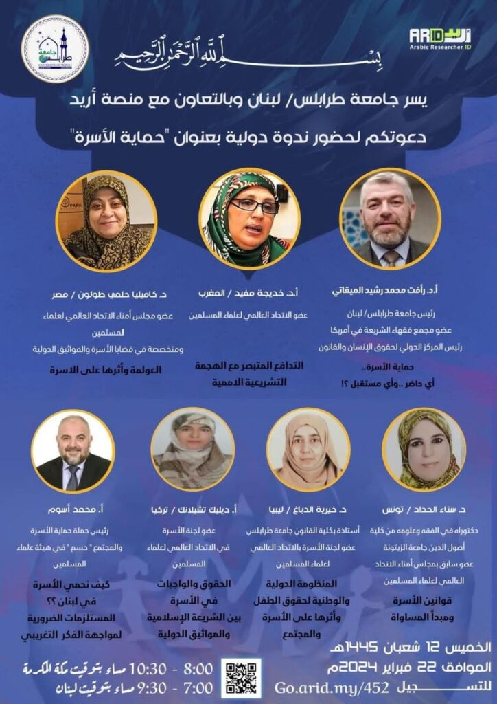 بالتعاون مع منصة أريد العلمية الدولية للناطقين باللغة العربية، تنظم جامعة طرابلس بلبنان ندوة دولية إلكترونية تحت عنوان “حماية الأسرة”، وذلك يوم الخميس 22 فبراير الجاري وسط مشاركة مجموعة من العلماء أعضاء الاتحاد العالمي لعلماء المسلمين