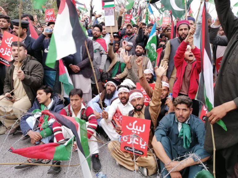 الجماعة الإسلامية في باكستان تنظم مظاهرة حاشدة في العاصمة إسلام آباد تعبيرًا عن التضامن مع غزة، حيث شارك الآلاف من الباكستانيين فيها