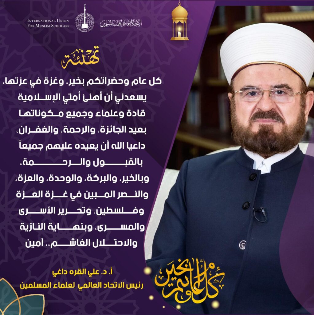 تهنئة الأمين العام للاتحاد العالمي لعلماء المسلمين بمناسبة عيد الفطر المبارك لعام 1445هـ/2024م