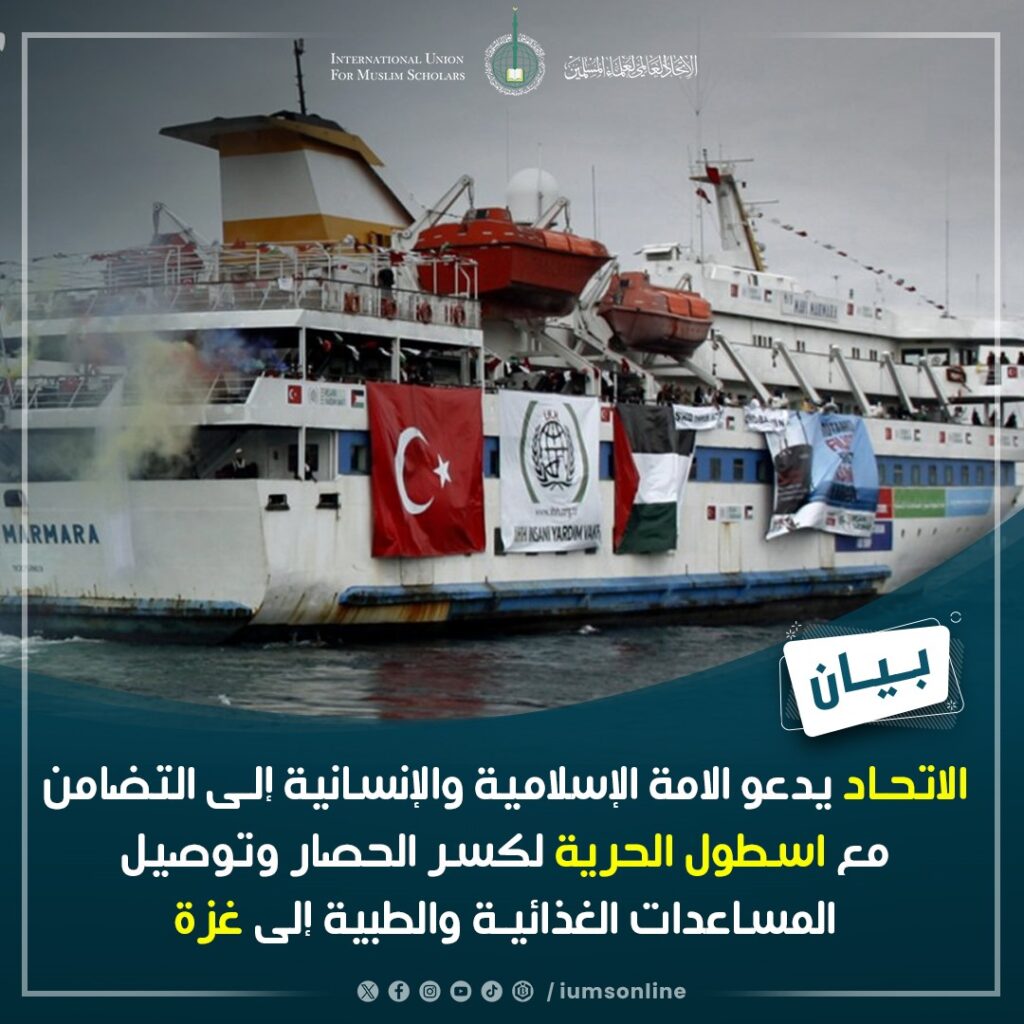 الاتحاد العالمي لعلماء المسلمين يدعو الامة الإسلامية والإنسانية إلى التضامن مع اسطول الحرية لكسر الحصار وتوصيل المساعدات الغذائية والطبية إلى غزة (بيان)