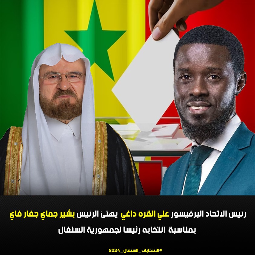 بعث فضيلة الشيخ الدكتور علي محيي الدين القره داغي رئيس الاتحاد العالمي لعلماء المسلمين، رسالة تهنئة إلى فخامة الرئيس بشير جماي جغار فاي رئيس جمهورية السنغال، بمناسبة انتخابه رئيساً للبلاد، وذلك بعد حصوله على ثقة كبيرة من الشعب السنغالي في انتخابات سادتها السلمية والديمقراطية.